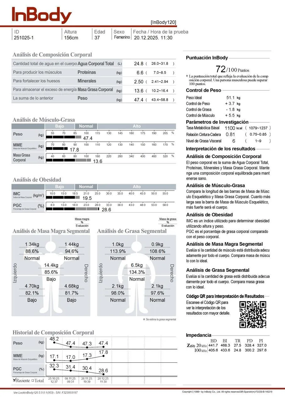 La báscula tradicional miente. Incluido en tu consulta: Análisis InBody 120 de grado médico. Conoce tu porcentaje real de grasa, masa muscular y agua en cada visita.